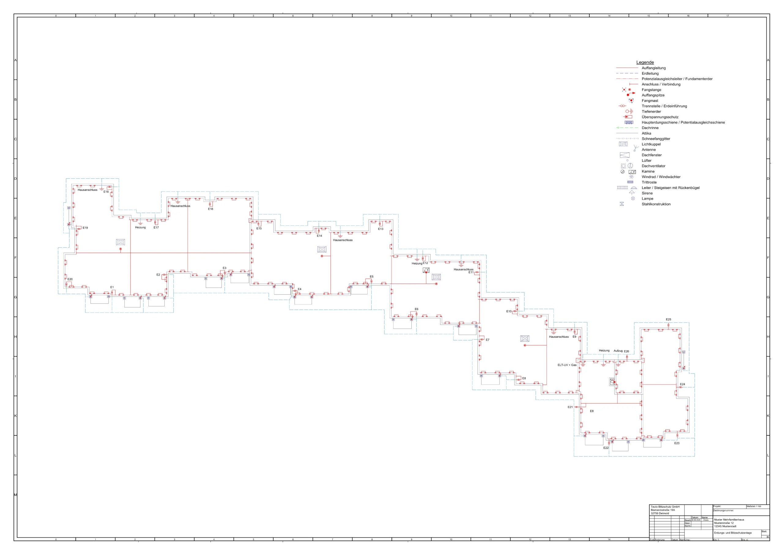 Auf dieser Grundlage entsteht ein vollständiges Schutzkonzept mit CAD-Planung, in dem alle Fangeinrichtungen, Ableitungen und Erdungsanschlüsse exakt dargestellt sind.